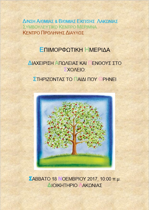 Η Διεύθυνση Δευτεροβάθμιας Εκπαίδευσης Λακωνίας, με πρωτοβουλία της Υπευθύνου του Συμβουλευτικού Σταθμού Νέων και των Υπευθύνων Σχολικών Δραστηριοτήτων Α/θμιας και Β/θμιας Εκπ/σης, οργανώνει, σε συνεργασία με το Κέντρο Πρόληψης Ν. Λακωνίας «Δίαυλος» και το Συμβουλευτικό Κέντρο για το Πένθος «Μέριμνα», επιμορφωτική ημερίδα με τίτλο: «Διαχείριση απώλειας και πένθους στο σχολείο».