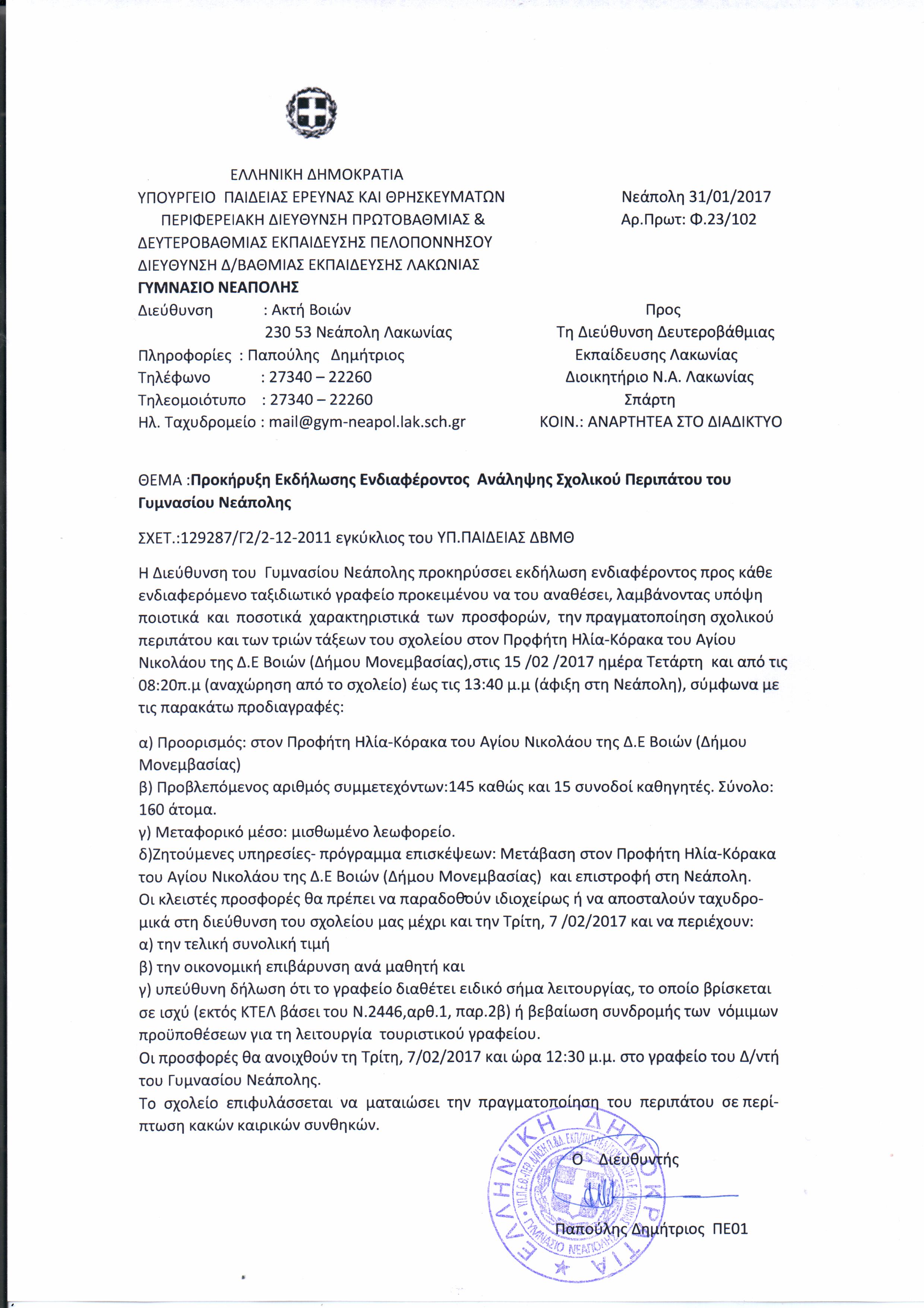 Πρόσκληση εκδήλωσης ενδιαφέροντος για την πραγματοποίηση σχολικού περιπάτου του Γυμνασίου Νεάπολης στον Προφήτη Ηλία-Κόρακα του Αγ. Νικολάου της Δ.Ε. Βοιών.