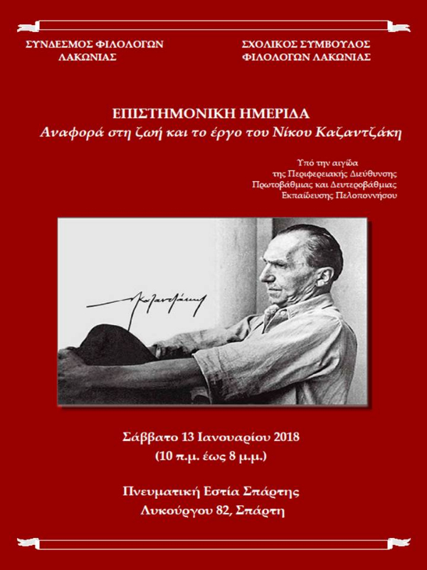O Σχολικός Σύμβουλος Φιλολόγων Λακωνίας και ο Σύνδεσμος Φιλολόγων Λακωνίας διοργανώνουν επιστημονική ημερίδα με θέμα: "Αναφορά στη ζωή και στο έργο του Νίκου Καζαντζάκη" το Σάββατο, 13 Ιανουαρίου 2018 στην Πνευματική Εστία Σπάρτης. Η ημερίδα τελεί υπό την αιγίδα της Περιφερειακής Διεύθυνσης Πρωτοβάθμιας & Δευτεροβάθμιας Εκπαίδευσης Πελοποννήσου.